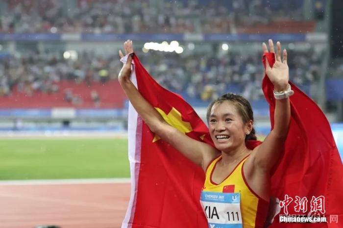 吴艳妮赛后身披国旗庆祝。刘占昆 摄