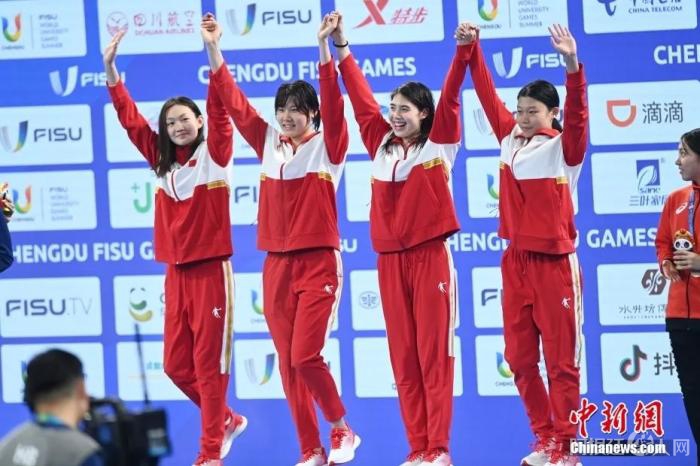 女子4×100米自由泳接力颁奖现场。张浪 摄