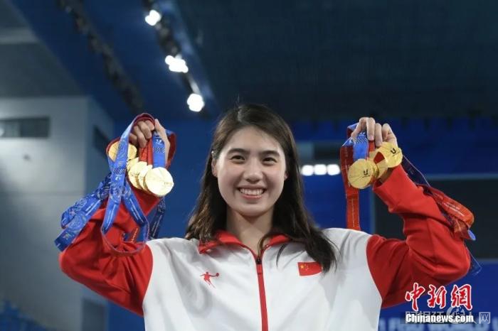 张雨霏展示金牌。安源 摄