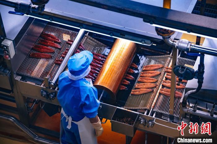 中印尼“两国双园”建设驶入快车道。图为福州元洪投资区一家食品企业内,工人正在抓紧生产蒲烧鳗鱼。 李南轩 摄
