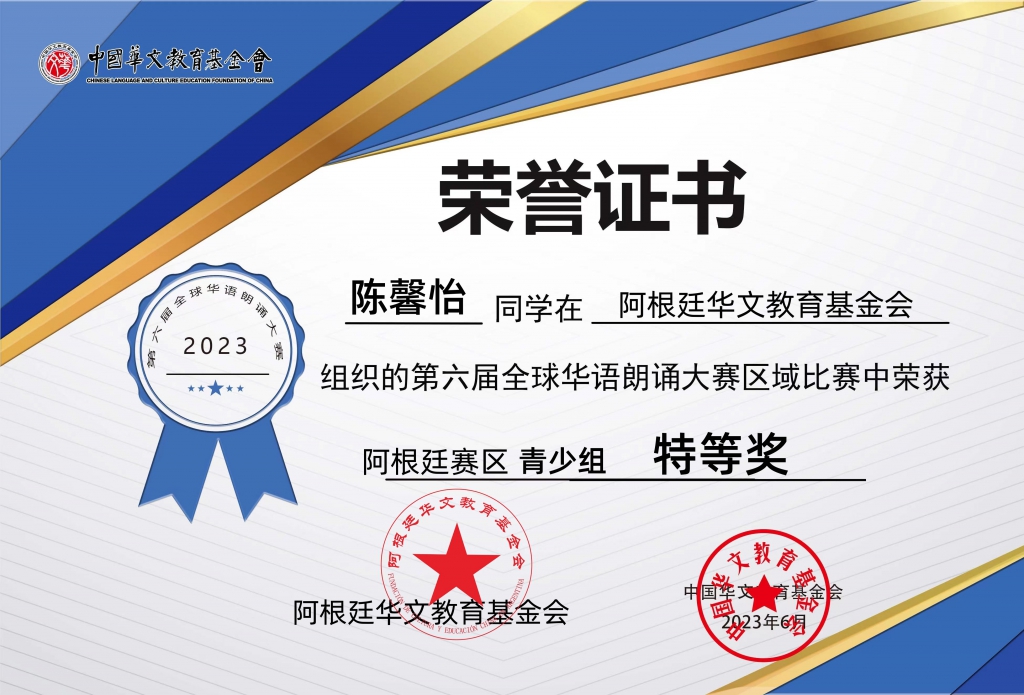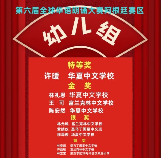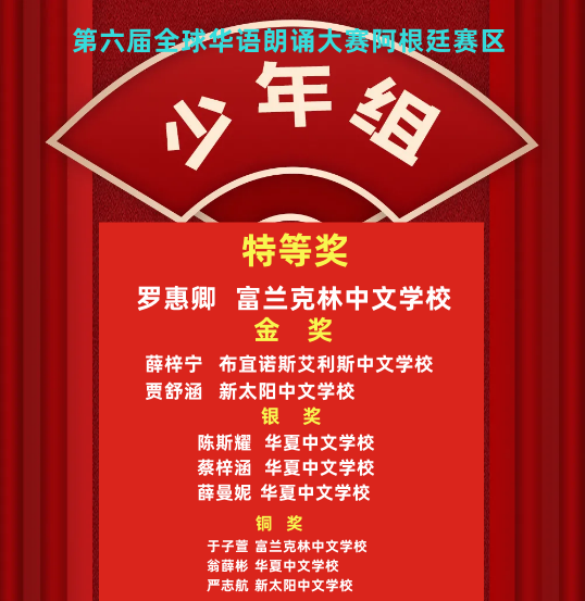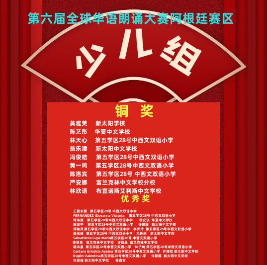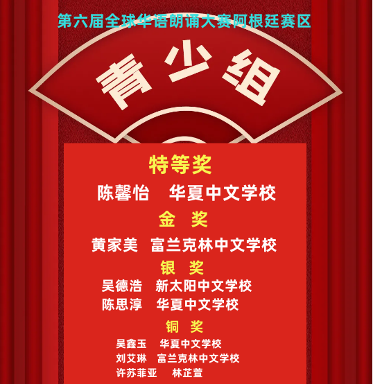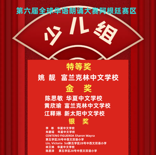 由中国华文教育基金会主办,完美(中国)有限公司资助,北京时间有限公司承办的第六届全球华语朗诵大赛,阿根廷赛区富兰克林中文学校罗惠卿获得青少组金奖、姚靓获得少儿组铜奖,华夏中文学校陈馨怡获得少年组铜奖。