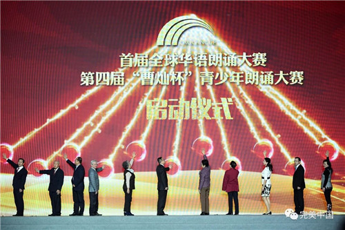 阿根廷华文教育基金会会长刘芳勇参加在北京人民大会堂举办的首届全球华语朗读大赛启动仪式(右二)