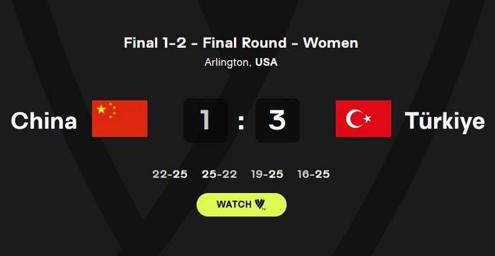 中新网7月17日电 2023年世界女排联赛总决赛于北京时间今天清晨在美国阿灵顿展开了最终决赛的争夺。中国女排1:3负于土耳其女排,获得亚军。四局比分为:22:25、25:22、19:25、16:25。这是自2018年世界女排联赛举办以来,中国女排在该赛事中取得的最好成绩。继续加油!