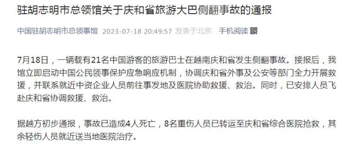 中新网7月18日电 据中国驻胡志明市总领事馆微信公众号18日消息,7月18日,一辆载有21名中国游客的旅游巴士在越南庆和省发生侧翻事故。