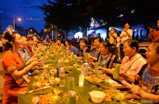 8月21日晚,2023年海南七仙温泉嬉水节的“千人舞·长桌宴”活动在保亭民族风情街举行,吸引近千名游客参与,品尝当地美食,感受黎族、苗族文化的独特魅力。