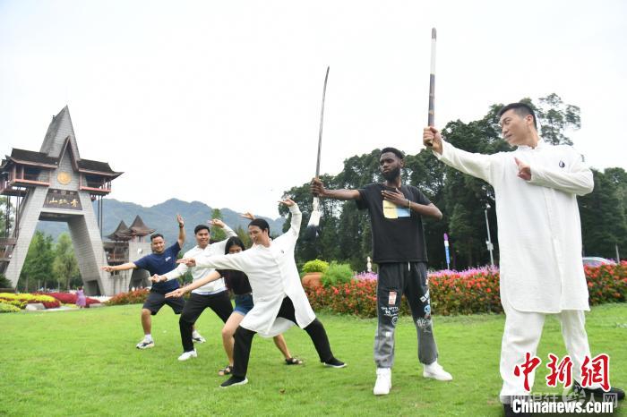 8月23日,外国青年在青城山脚下习练青城派武术。中新网记者 张浪 摄