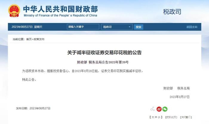 中新网8月27日电 据财政部网站消息,27日,财政部、税务总局发布《关于减半征收证券交易印花税的公告》。 公告指出,为活跃资本市场、提振投资者信心,自2023年8月2...