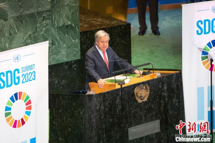 当地时间9月18日,联合国可持续发展目标峰会在纽约联合国总部拉开帷幕。当天,联大通过一项政治宣言,会员国承诺加速实现2030年可持续发展目标。图为联合国秘书长古特雷斯发表讲话。 中新社记者 王帆 摄