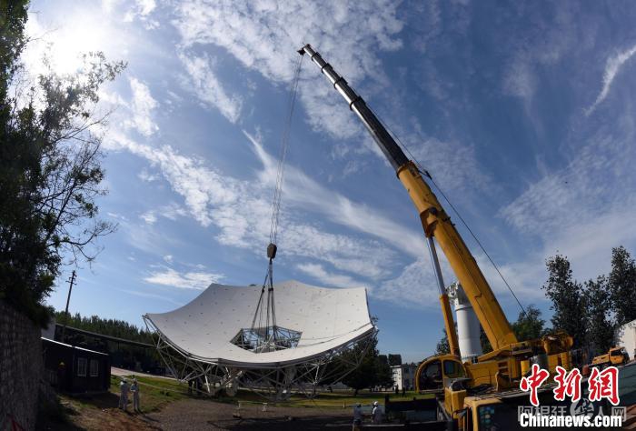 中新网石家庄9月20日电 (记者 孙自法)全球在建最大射电天文望远镜阵列——国际大科学工程平方公里阵列射电望远镜(SKA)项目中,中国牵头研制成功的首台中频天线,9月20日在位于河北石家庄的中国电科网络通信研究院测试现场正式吊装。