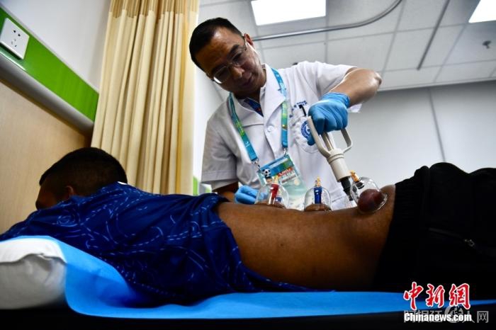 资料图:成都大运会期间,运动员体验拔罐。中新社记者 张浪 摄