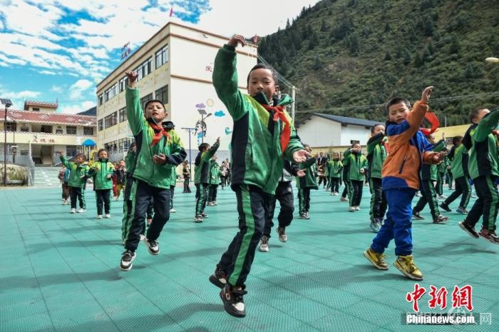 雄龙西乡小学的学生们在课间操时跳起锅庄舞。中新网记者 李骏 摄