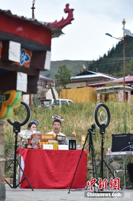在腰古村里,四川移动和新龙县电商中心的工作人员在直播中向观众推荐雪菊茶、糌粑脆片等当地特产。中新网记者 李骏 摄