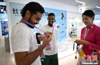 9月21日,浙江杭州,沙特运动员与运动员村内工作人员交换徽章。 中新社记者 赵文宇 摄