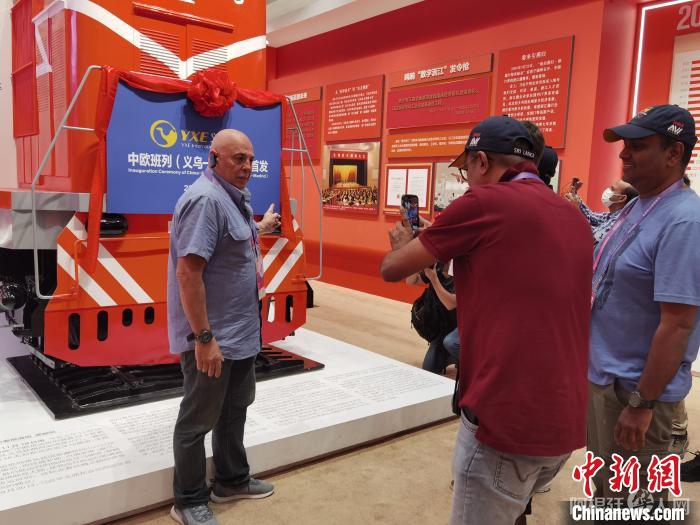 外国媒体记者在中欧班列的模型前合影。 鲍梦妮 摄