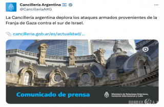 公告称:“阿根廷外交部对加沙地带针对以色列南部的武装袭击感到遗憾”;“阿根廷政府谴责哈马斯对以色列领土的恐怖行动,并呼吁结束暴力,确保保护平民。”