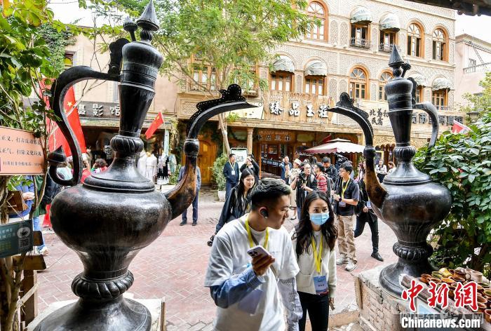 图为港澳台和东南亚华文新媒体走进“一带一路”核心区主题采访活动采访团在喀什古城景区花盆巴扎采访。中新网记者 刘新 摄