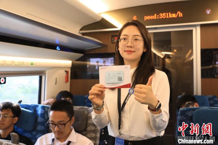 当地时间10月17日,印尼雅万高铁正式开通运营。图为乘客在列车上展示车票,背后是时速表。中新社记者 李志全 摄