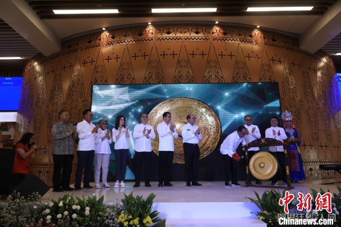当地时间10月17日,印尼雅万高铁正式开通运营。印尼交通部长布迪敲响象征开通运营的锣鼓。中新社记者 李志全 摄