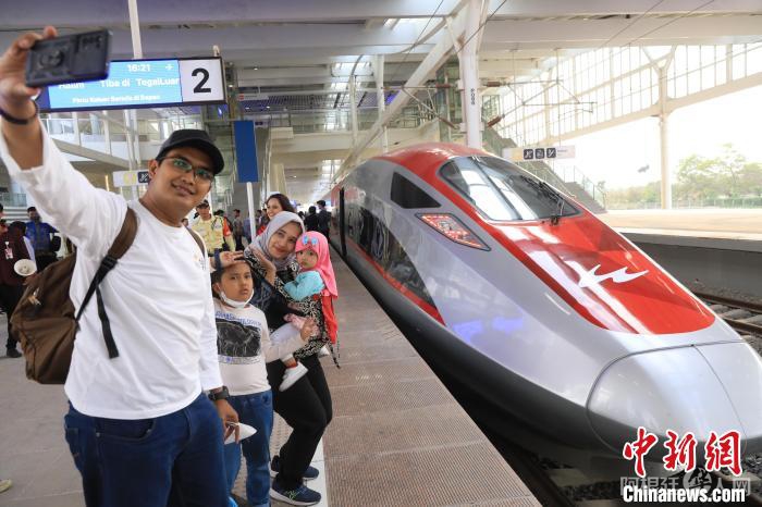 采用银红相间涂装的G1137次动车组列车就停靠在月台。乘客们围着昵称为“红色科莫多”的列车拍照打卡,只为记录这一历史性时刻——这是印尼和东南亚第一条高速铁路。