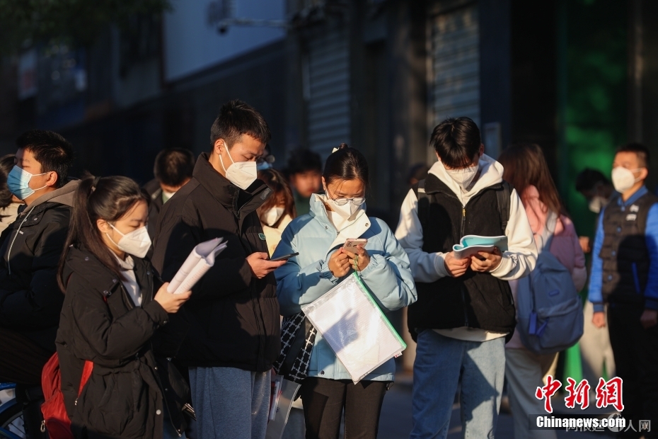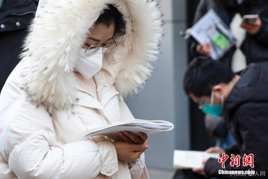 2023年 1月8日,郑州,河南省商务中等职业学校考点外,考生入场前复习。当日,中央机关及其直属机构2023年度考试录用公务员公共科目笔试举行。中新社发 程航 摄