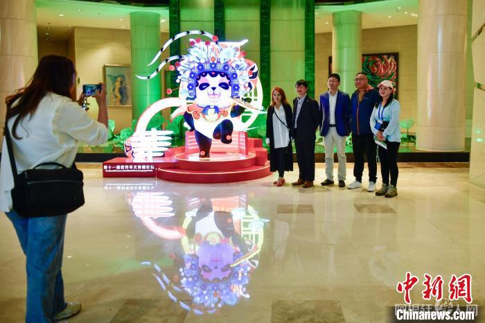 中新网成都10月22日电 (王利文)22日晚,位于成都世纪城国际会议中心的第十一届世界华文传媒论坛会场光影流动。在彩灯“熊猫掌茶”前,功夫熊猫轻巧地挥舞着茶壶,茶水洒在杯中形成朵朵茶花。现场,大熊猫、茶、川剧、三星堆、四川美食等特色文化元素的彩灯灯组吸引眼球,不少海外华文媒体代表掏出手机拍照留念。