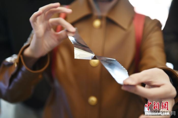 图为中国宝武山西太钢不锈钢精密带钢有限公司里展示的“手撕钢”。中新网记者 李骏 摄