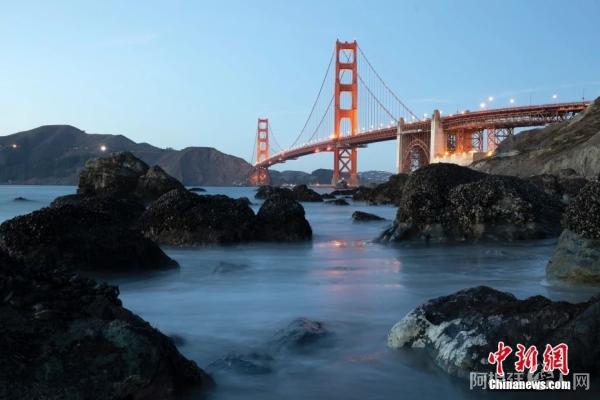 图为美国旧金山金门大桥在海浪和夜色的衬托下美如一幅画。刘关关 摄
