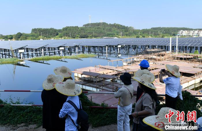 11月5日,参与“行走中国·第六届海外华文媒体漳州行”的25家海外华文媒体代表,参访位于福建漳州云霄县的中核云霄陈岱5万千瓦渔光互补项目。该项目是福建2022年集中式光伏电站首批试点项目之一,“渔光互补”是指渔业养殖与光伏发电相结合,在鱼塘水面上方架设光伏板阵列,光伏板下方水域可以进行鱼虾养殖,光伏阵列还可以为养鱼提供良好的遮挡作用,形成“上可发电、下可养鱼”的发电新模式。