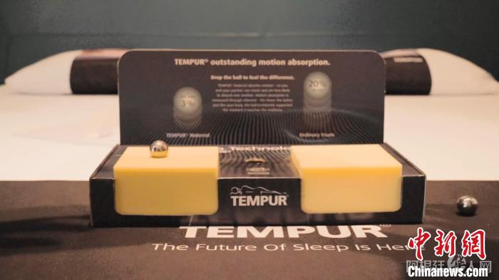 在位于上海文定路的TEMPUR泰普尔生活馆,泰普尔(中国)董事总经理袁涛现场演示了泰普尔材料的特殊之处。他垂直向下扔出两个小钢球,一颗掉在了普通海绵上,另一颗落在普泰尔材料上,在下落高度和材料体积一致的情况下,普通海绵弹开了钢球,而泰普尔材料则稳稳地接住了钢球。袁涛告诉记者,泰普尔材料可以吸收人体躺下时产生的压力,让消费者睡得更轻松。