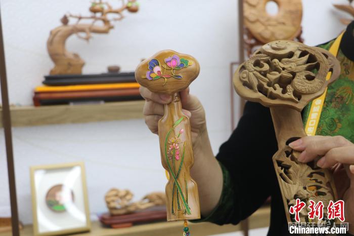 6日,山东省级非遗桃木雕刻民俗技艺传承人王来新桃木雕刻作品亮相第六届进博会。中新社记者 赵强 摄