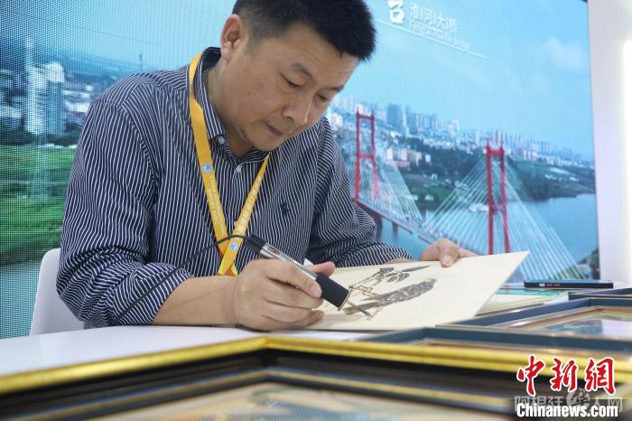 6日,在第六届进博会上,安徽省工艺美术大师、淮南烙画非遗传承人郑红伟正熟练地烙绘飞禽画作。中新社记者 赵强 摄