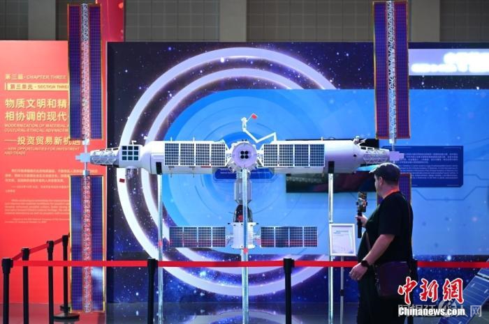 11月5日,观众在进博会中国馆参观拍摄中国空间站模型。中新社记者 田雨昊 摄