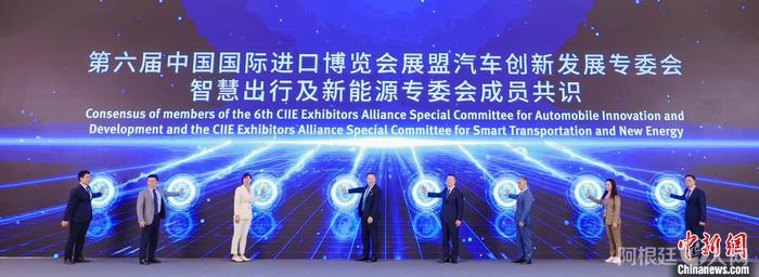《第六届中国国际进口博览会展盟汽车创新发展专委会、智慧出行及新能源专委会成员共识》发布现场。