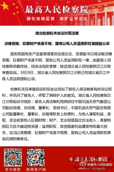 蒋洁敏李春城涉嫌受贿等被公诉(图) 国内新闻 • 2015-03-19 09:15• 收藏本文 7GY阿根廷华人网 蒋洁敏被公诉 转载本网稿件,原则上需要书面授权,不得篡改稿件主题。本网随时有权要求第三方停止侵权行为。 本网所载内容或图片,若涉及侵权,请联系删除。 19 ___________ 2015/03 蒋洁敏李春城涉嫌受贿等被公诉(图) 蒋洁敏被公诉李春城被公诉蒋洁敏李春城 【湖北检察机关依法对蒋洁敏涉嫌受贿、巨额财产来源不明、国有公司人员滥用职权案提起公诉】 新华社北京3月19日电记者今天从 [ 微信长按识别二维码或扫码查看分享内容 ]