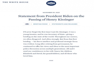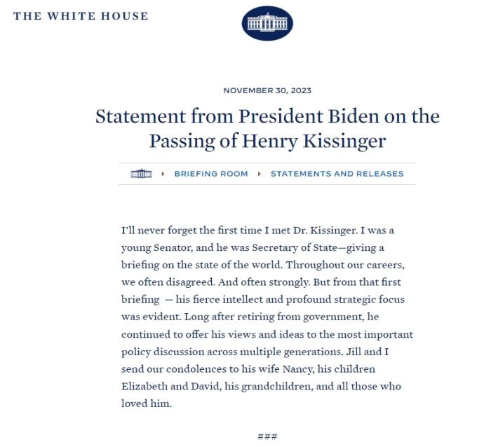 中新网12月1日电 综合报道,美国前国务卿基辛格于当地时间11月29日去世,享年100岁。当地时间11月30日,美国白宫网站发布了拜登的哀悼声明。图片来源:美国白宫网站...