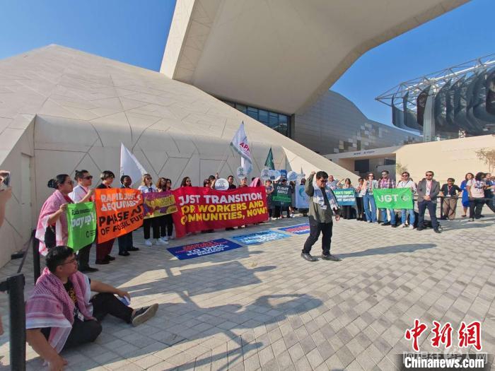 12月9日,阿联酋迪拜,抗议者在联合国气候变化迪拜大会蓝区会场集会并呼吁公正转型。 中新社记者 庞无忌 摄