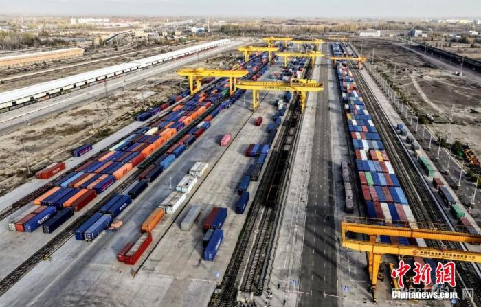 资料图:霍尔果斯铁路口岸有序排列的集装箱。中新网记者 刘新 摄