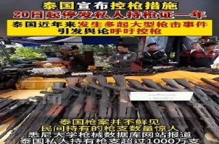 中新社曼谷12月20日电 (记者 李映民)泰国内政部秘书兼发言人黛素丽20日向媒体透露,鉴于近期在公共场所发生多宗因携带枪支严重威胁无辜民众的生命和财产安全,同时扰乱社会秩序的事件,泰国总理府办公室和内政部宣布在未来的一年内暂停发放所有枪支许可证。