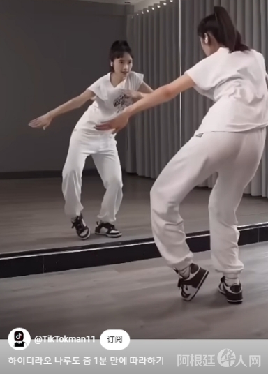 图为韩国博主录制教学视频,手把手教跳“科目三”。图片来源:社交媒体截图