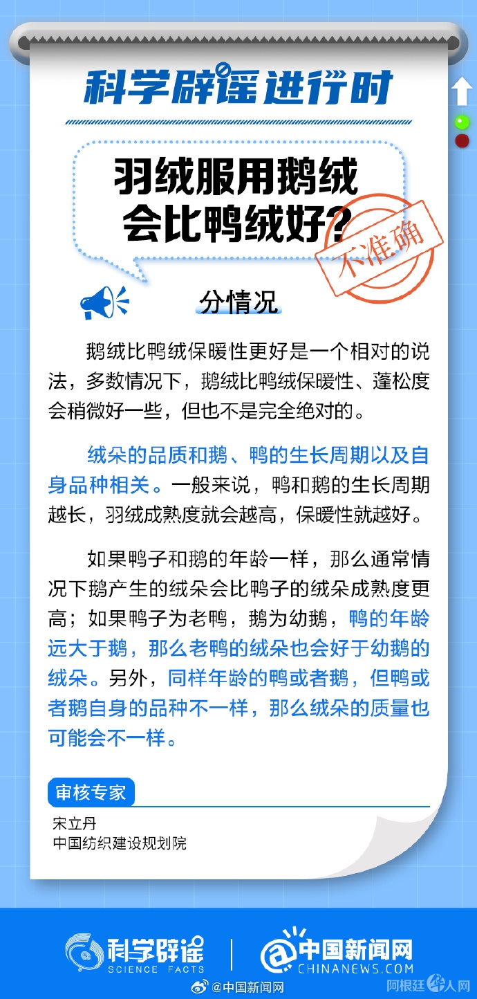 中新网12月25日电 多数情况下,鹅绒比鸭绒保暖性、蓬松度会稍微好一些,但也不是完全绝对的。绒朵的品质和鹅、鸭的生长周期以及自身品种相关。一般来说,鸭和鹅的生长周期越长,羽绒成熟度就会越高,保暖性就越好。(来源:@科学辟谣 @中国新闻网 )