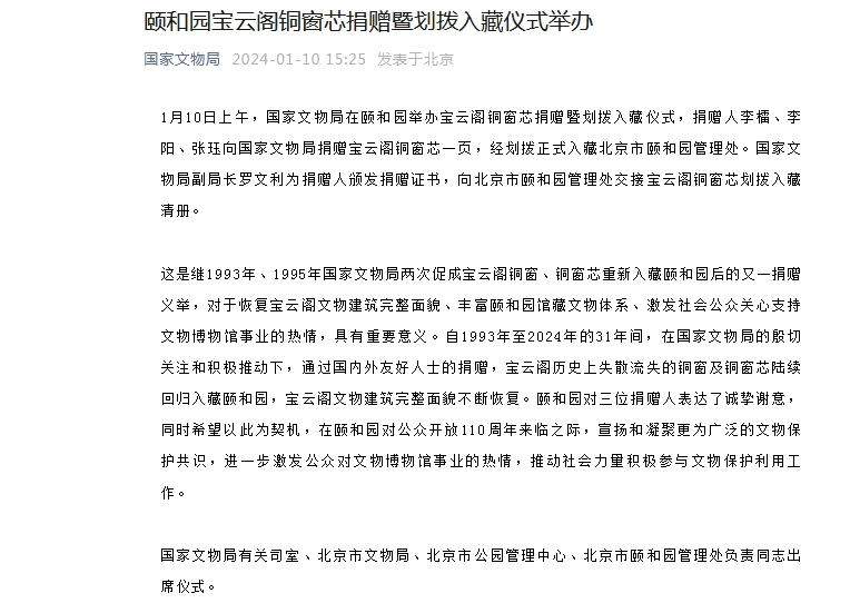 这是继1993年、1995年国家文物局两次促成宝云阁铜窗、铜窗芯重新入藏颐和园后的又一捐赠义举,对于恢复宝云阁文物建筑完整面貌、丰富颐和园馆藏文物体系、激发社会公众关心支持文物博物馆事业的热情,具有重要意义。自1993年至2024年的31年间,在国家文物局的殷切关注和积极推动下,通过国内外友好人士的捐赠,宝云阁历史上失散流失的铜窗及铜窗芯陆续回归入藏颐和园,宝云阁文物建筑完整面貌不断恢复。颐和园对三位捐赠人表达了诚挚谢意,同时希望以此为契机,在颐和园对公众开放110周年来临之际,宣扬和凝聚更为广泛的文物保护共识,进一步激发公众对文物博物馆事业的热情,推动社会力量积极参与文物保护利用工作。
