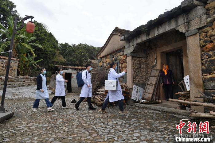 在泉港区涂岭镇樟脚村,区、镇、村三级医生开展定期入户巡诊活动,医生护士们携带便携式彩超仪等设备在前往村民的路上。洪坤泽摄