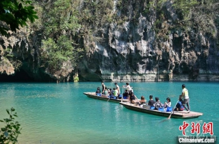 3月24日,广西河池三门海景区,游人乘船欣赏美景。 俞靖 摄