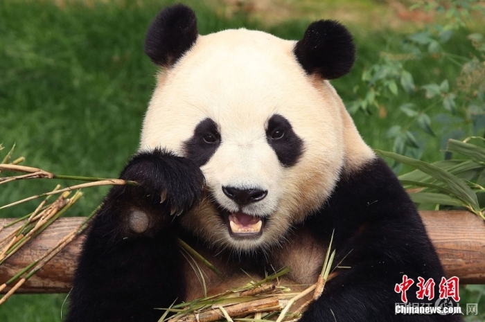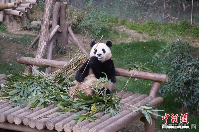 当地时间3月3日,旅韩大熊猫“福宝”在韩国三星爱宝乐园熊猫世界内吃竹子。中新社发 王刚 摄