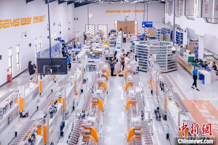 2023年6月20日,福建莆田双驰鞋业个性化定制示范工厂流水线上,工人们有条不紊地工作。 中新社记者 李南轩 摄