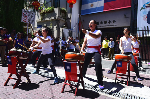 台湾侨胞表演的太鼓声声震天。