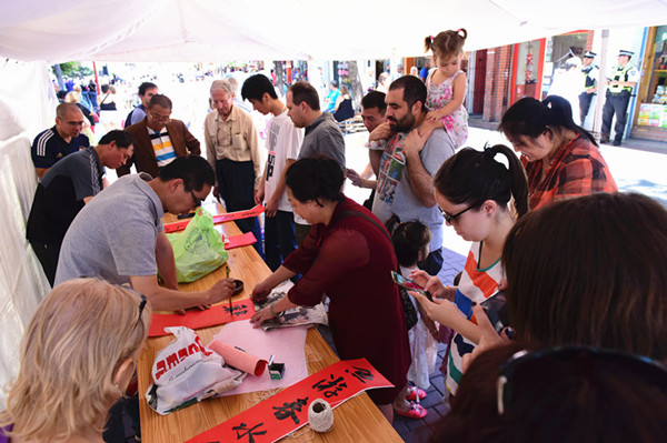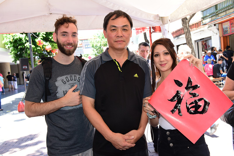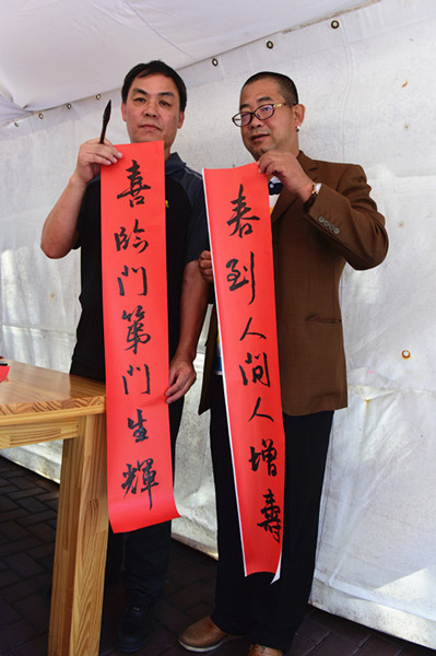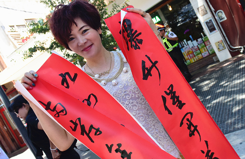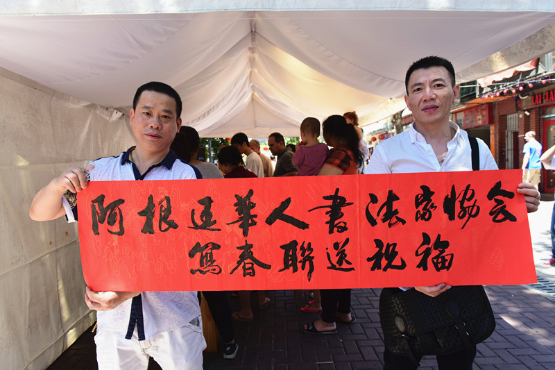 刚刚成立的阿根廷华人书法家协会部分会员,在严昌庭主席,邱宏強常务副主席及旅阿华人书法家陈国樑的带领下,来到庙会现场为旅阿华人和布市市民“写春联送祝福”,送去阿根廷华人对布市市民的美好祝愿。