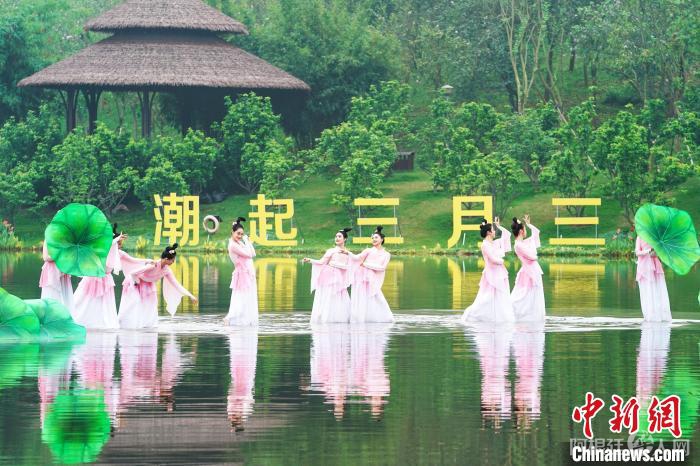 4月11日,2024年“广西三月三·八桂嘉年华”文化旅游品牌活动在南宁市青秀山风景区开幕,舞者在水面上起舞。陈冠言 摄