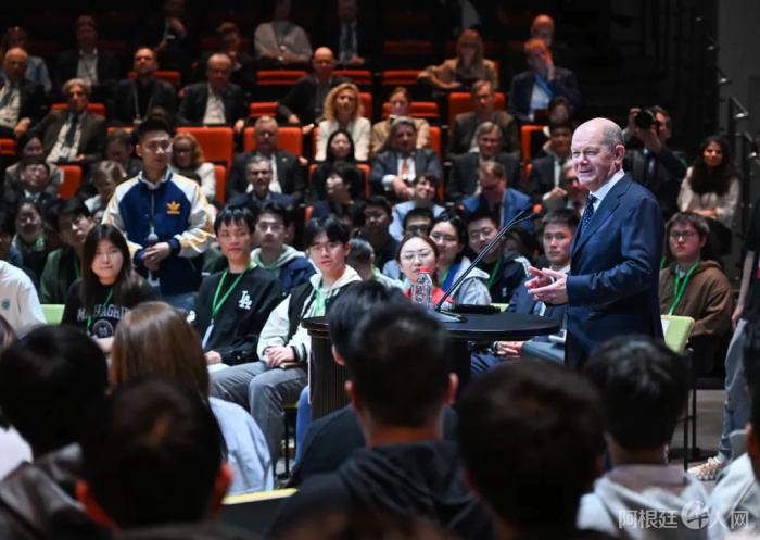 随后,朔尔茨邀请在座学生提问。同学们踊跃举手发言,分别就城市化发展、电动汽车普及等主题展开了对话。现场不时传出笑声和掌声。