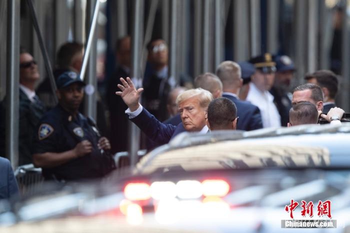 资料图:当地时间2023年4月4日,美国前总统特朗普抵纽约曼哈顿刑事法院就“封口费”案接受提审。中新社记者 廖攀 摄